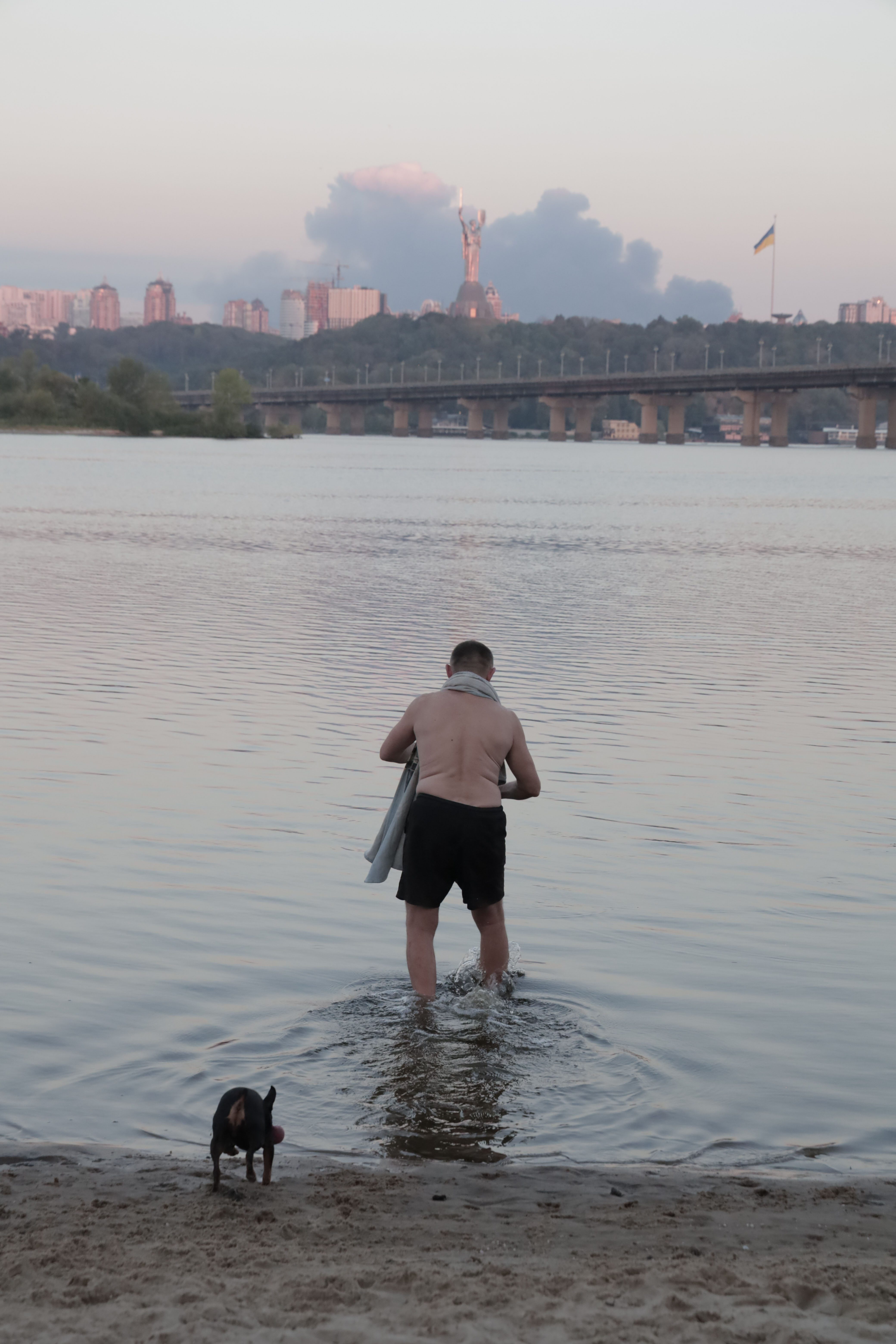 Чоловік купається у річці Дніпро на тлі задимлення, утвореного у результаті російського обстрілу столиці. Київ, Україна, 7 вересня 2025 року. Фото Назара Фурика