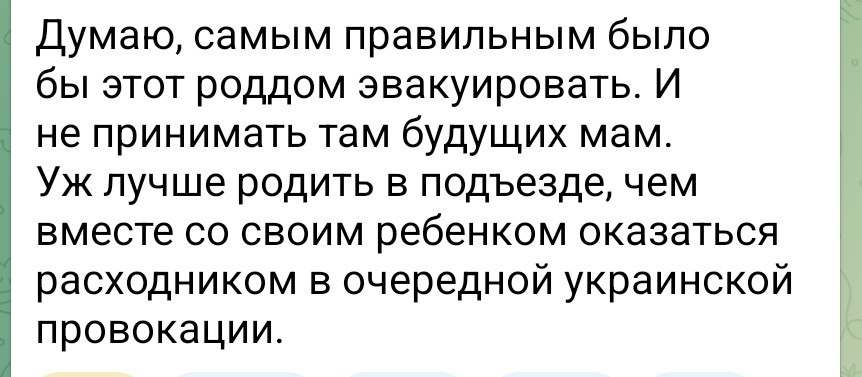 “I think it would be best to evacuate this maternity ward. And do not accept future mothers there. It is better to give birth in the entrance than to be with your child a starting material in another Ukrainian provocation”.