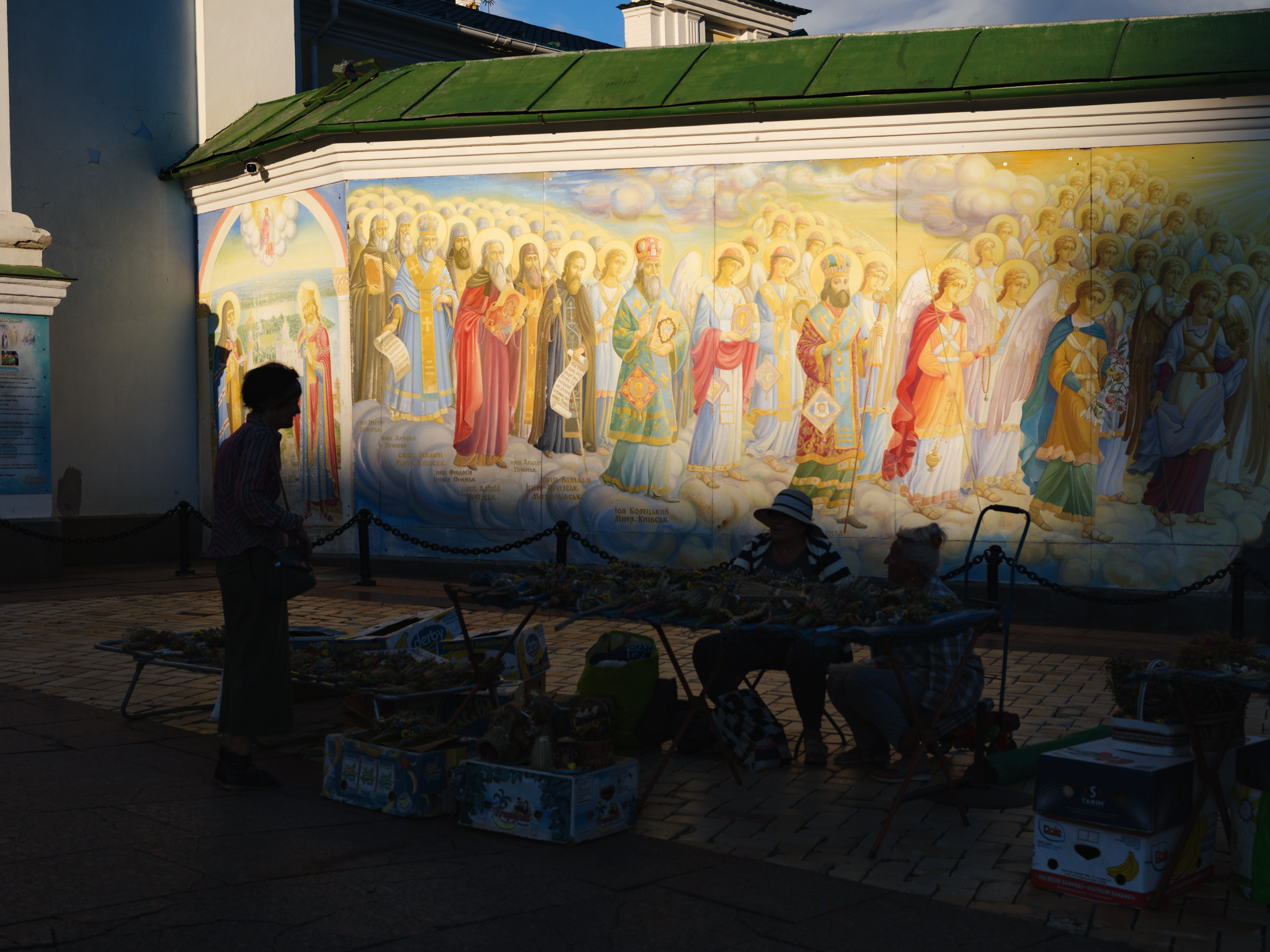 All this photo creates the only truly ingenious trick with light. The picture shows the wall of Mikhailovsky Golden-topped in Kiev and a fresco created by the artist Volodymyr Pasyvenko. A year before Louis Armstrong recorded his When the Saints Go Marching In, the Soviets blew up the main temple of the monastery. A year after Armstrong recorded When the Saints Go Marching In, an artist was born who will paint this wall in the future. A month after the birth of the future author of this image, for most Europeans, the Second World War will begin. I write this without any overtones — I just juggle the years and the way photographer Serhiy Korovany captured the idea of the artist Volodymyr Pasyvenko.