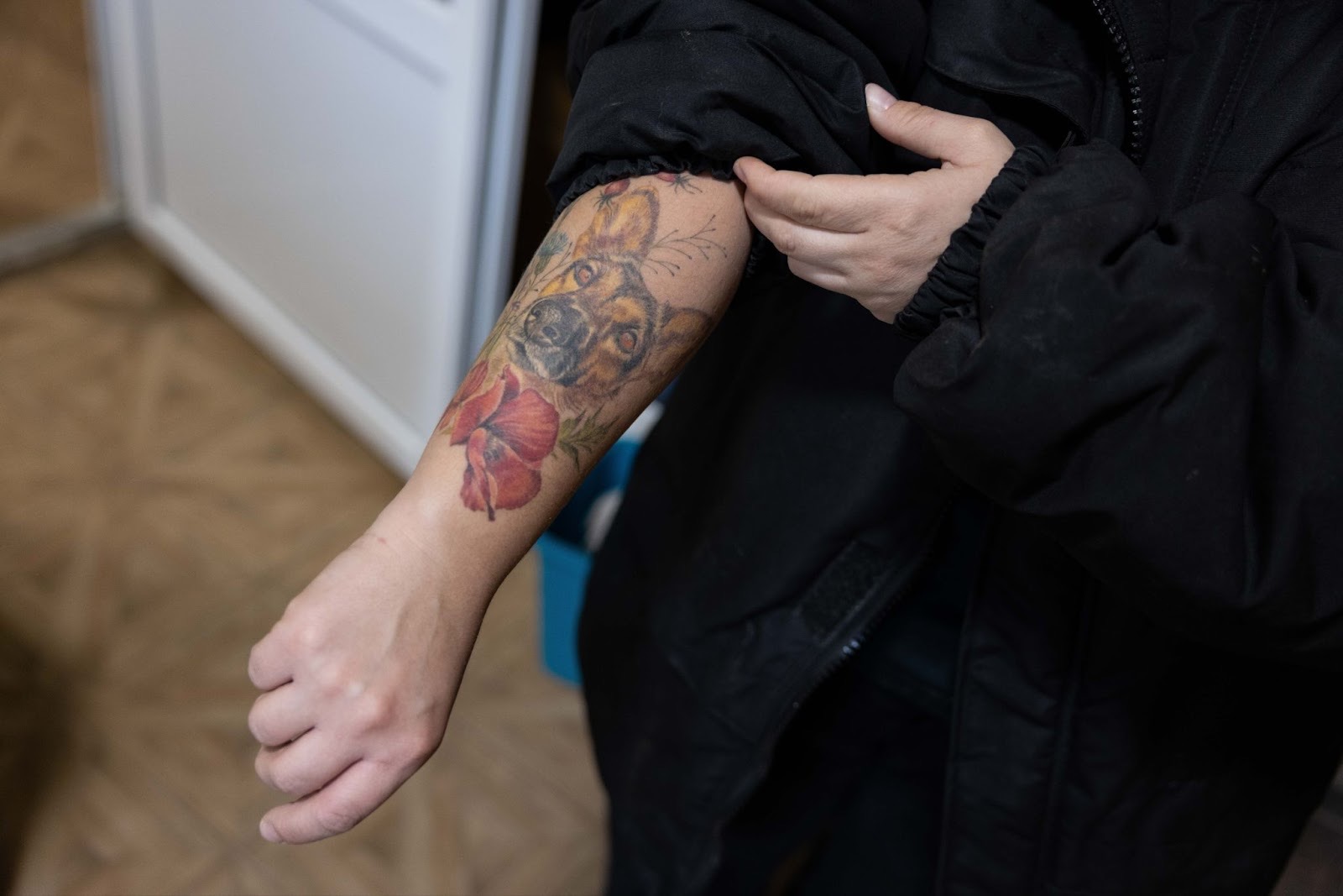 На руці Анастасії татуювання з песиком. Вона за фахом — собачий психолог, але зображення домашнього улюбленця з’явилось після початку повномасштабної війни. Жінка разом з дітьми потрапила у Чернівці з окупованої нині території. Поїхати далі від лінії фронту вирішила, коли діти почали запитувати про війну та смерть. Спочатку Анастасія жила на Закарпатті — у неї почалися панічні атаки, дезорієнтація. В якийсь момент вона знайшла у соцмережах інформацію про «Місто Добра», де їй надали юридичну, медичну та психологічну допомогу. Сьогодні вона працює у притулку для тварин на території «Міста Добра» і навіть забрала песика звідти. Саме він зображений на її руці.
