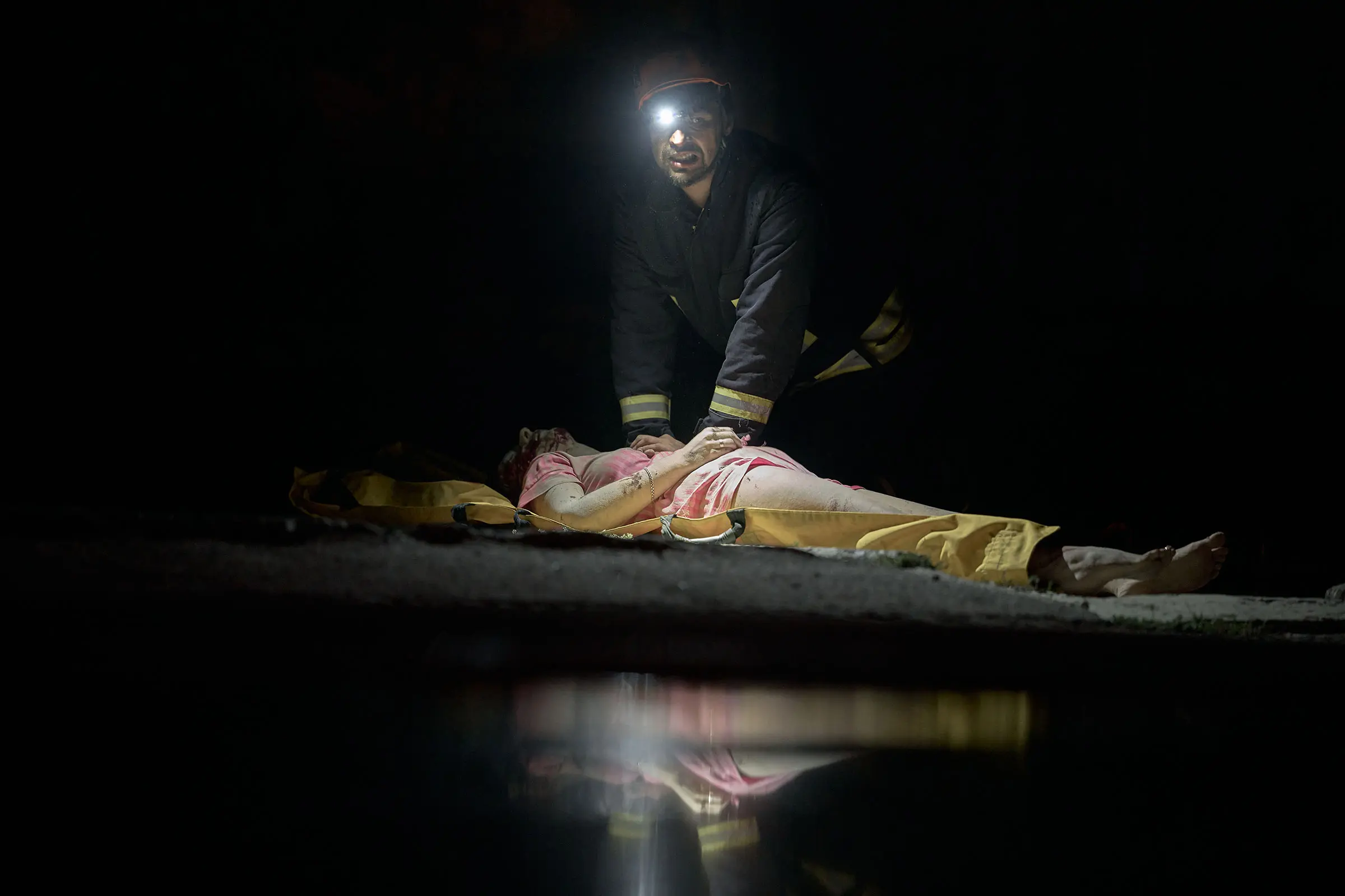 Рятувальник надає допомогу потерпілій біля житлового будинку, ураженого російською ракетою у Києві, Україна, 28 серпня. За словами міністра внутрішніх справ Ігоря Клименка, ракета влучила між третім і четвертим поверхами п'ятиповерхового будинку, вбивши щонайменше чотирьох людей. Костянтин Ліберов — Libkos/Getty Images