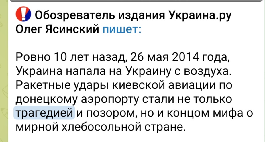 «Рівно 10 років тому (публікація 2024 року — авт.), 26 травня 2014 року Україна напала на Україну з повітря. Ракетні удари київської авіації по донецькому аеропорту стали не лише трагедією та ганьбою, а й кінцем міфу про мирну гостинну країну».
