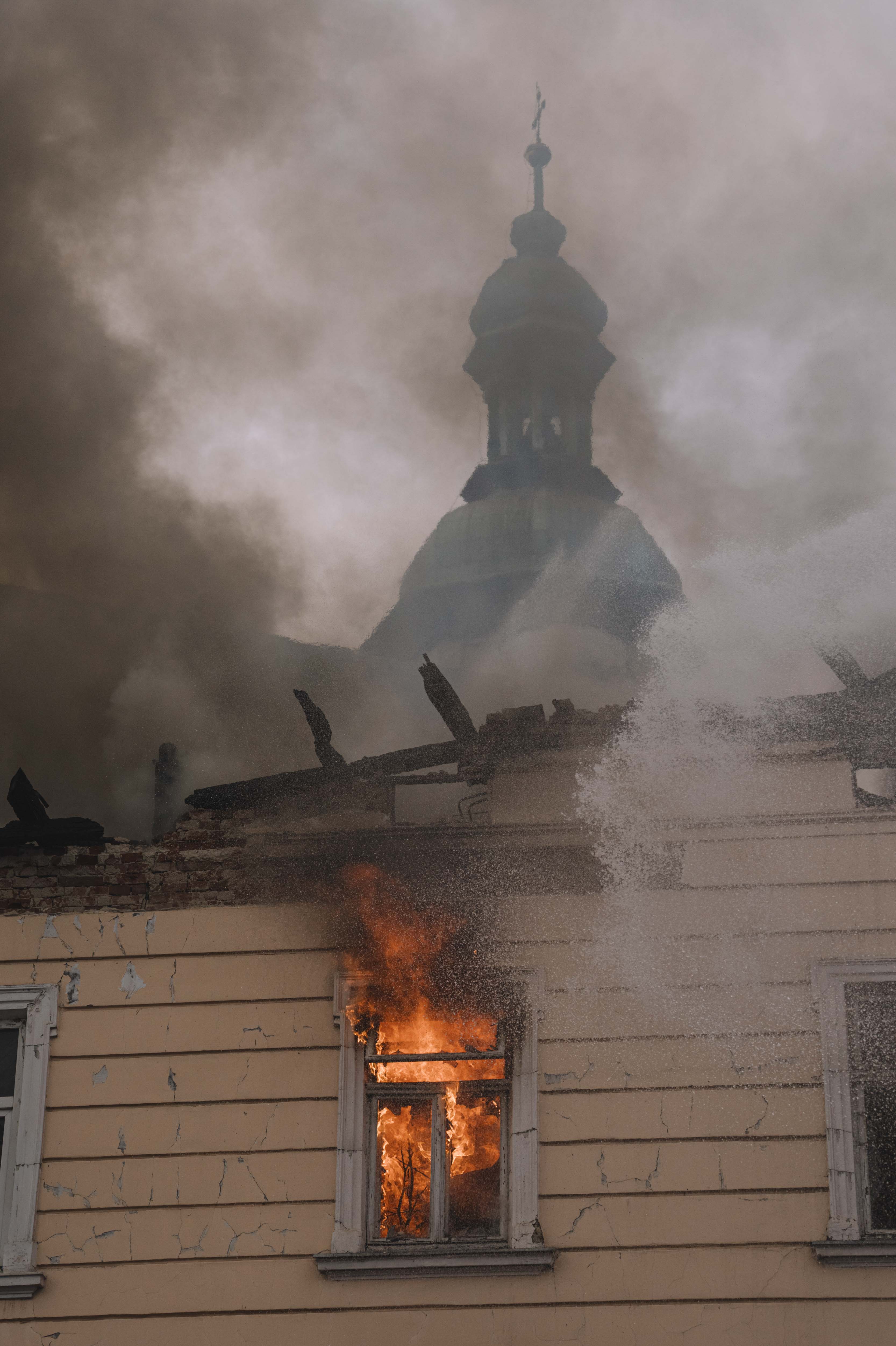 Будівля горить після російського удару безпілотником по об’єкту Світової спадщини ЮНЕСКО у Львові, Україна, 24 березня 2026 року. Повітряні сили України зафіксували понад 550 запусків з боку Росії, удари були завдані по всій території країни, зокрема у Львові та Тернополі. Фото Андрія Кравченка / Bloomberg News