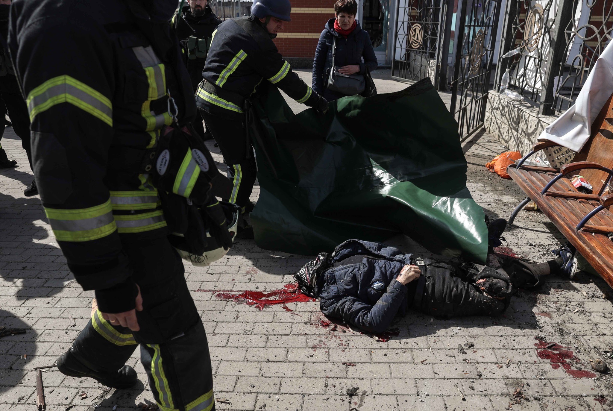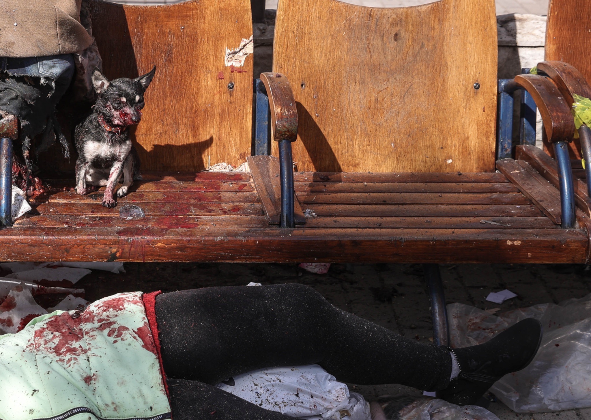 Поруч жінка стоїть біля мертвих тіл і набирає номер телефона чоловіка. Видно, в цьому місці розірвався боєприпас і людей жахливо понівечило. Вона хоче переконатись, що то його тіло, може десь в кишені задзвонить телефон… Вона лише на декілька хвилин відійшла і от таке сталося… Під парканом на лавочці тремтить маленький той-тер`єр. Уламок наскрізь пробив песику верхню щелепу. Перелякані очки, закривавлене хутро. Поруч до невпізнанності понівечене тіло хазяїна. Якась дівчина забирає собаку. Повз тіла ведуть молоду жінку, яка б’ється в істериці».