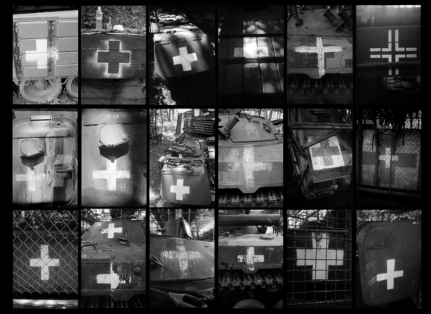 Проте у проєкті «Мистецтво війни, або Правила догляду за автоматом», окрім триптихів, є сформовані з багатьох кадрів величезні панно. Приміром, зі світлин «плюсів», якими військові маркують техніку. Є великі колажі зі світлин спорядження та екіпірування військових. Хлопці між тренуваннями скидали з себе броню, каски, складали автомати — і я фотографував, як ці речі лежать. Шукав красиве у звичних речах. Схожий типологічний підхід можна знайти у роботах французького фотографа Антуана д’Агати. Він працював в Україні після деокупації міст Київщини, зокрема Бучі, та створив монументальні сітки з кадрів, на кожному з яких зображена лише одна річ — дитяча іграшка, гільза, залишений черевик чи предмет побуду зі зруйнованого будинку. Такі поєднання кадрів насправді не нові, але вони завжди вражають.