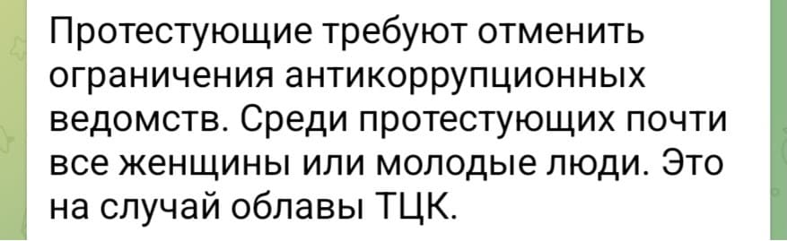 «Протестувальники вимагають скасувати обмеження антикорупційних відомств. Серед протестувальників майже всі жінки та молоді люди. Це на випадок облави ТЦК».
